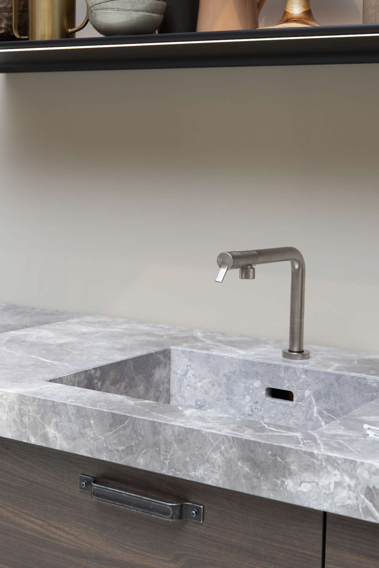 Meer meubel dan keuken? Combinatie ton-sûr-ton met écht marmer, een speelse keuken met bladen in verschillende diktes. Het werkblad is doorgetrokken naar de achterwand, met als finishing touch een plank uit marmer. Ook de spoelbak is vervaardigd uit hetzelfde natuursteen. We...